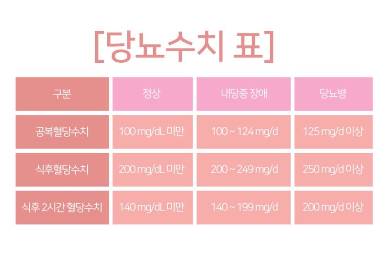 정상인의 경우 8시간 이상 금식 후 혈당검사를 했을 때 70~100mg/dL 사이이며, 식후 2시간 이후 검사에서는 140mg/dL 미만입니다.